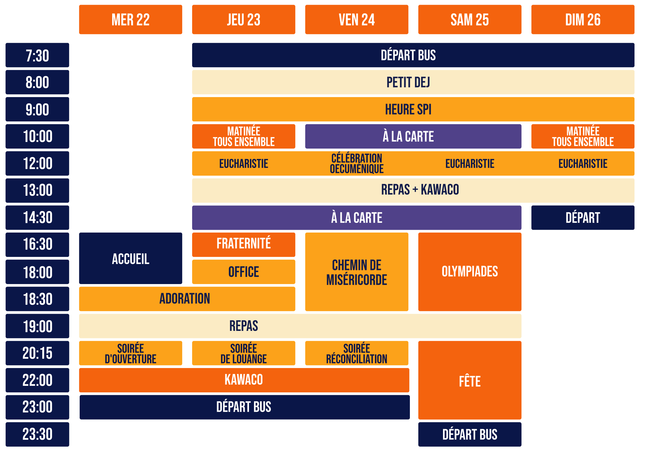 Un concept qui a déjà touché beaucoup de personnes : un festival à la carte où, chaque jour, tu peux choisir parmi une vingtaine de propositions – sports, conférences, temps spirituels, partages fraternels, moments de détente. La semaine est aussi rythmée par des temps forts, des soirées, de la musique, de la louange et des moments festifs.